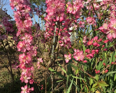 かわいい庭梅の花 咲いた後の小さな梅の実も赤くて綺麗です