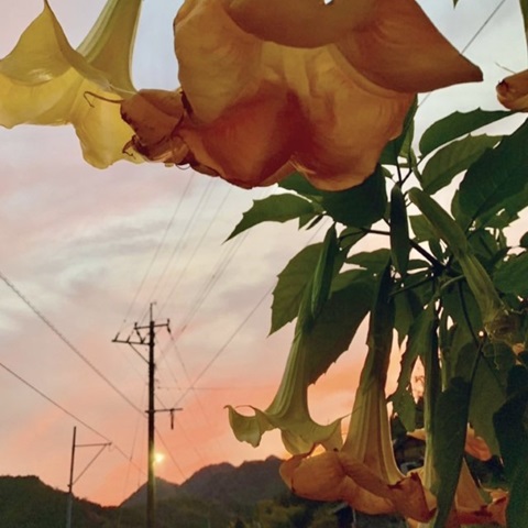 夕暮れ時。見事な夕焼けに負けず劣らず咲くエンジェルストランペットの花。