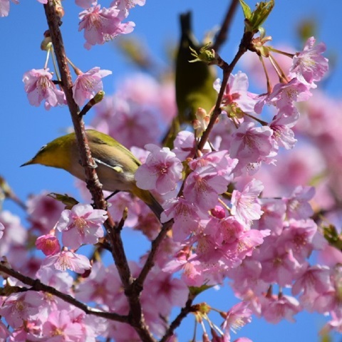 四浦半島の満開の河津桜とメジロ