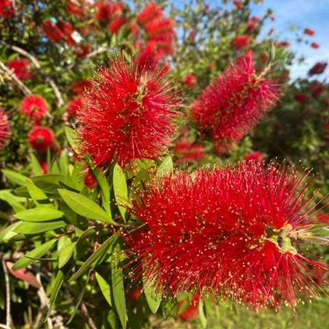 空をお掃除してくれるかな? 別府の公園を散歩中に発見! ブラシノキがみんなで青空をお掃除してるようでした。