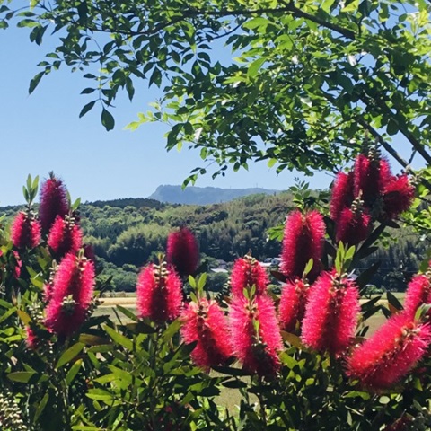 ブラシの花と八面山そして青空 こんな綺麗なブラシで掃除すると楽しいかな?